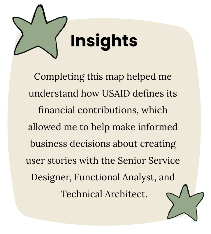 Through interviews and interactions with the client, the Steampunk team discovered a complex network of systems and databases within USAID. To leverage USAID's existing data and understand which database was needed to integrate with the ECRM, I worked closely with Steampunk's data architect to identify databases suitable for integration by building the eco-system map below to understand the connections, data gaps, and uses.