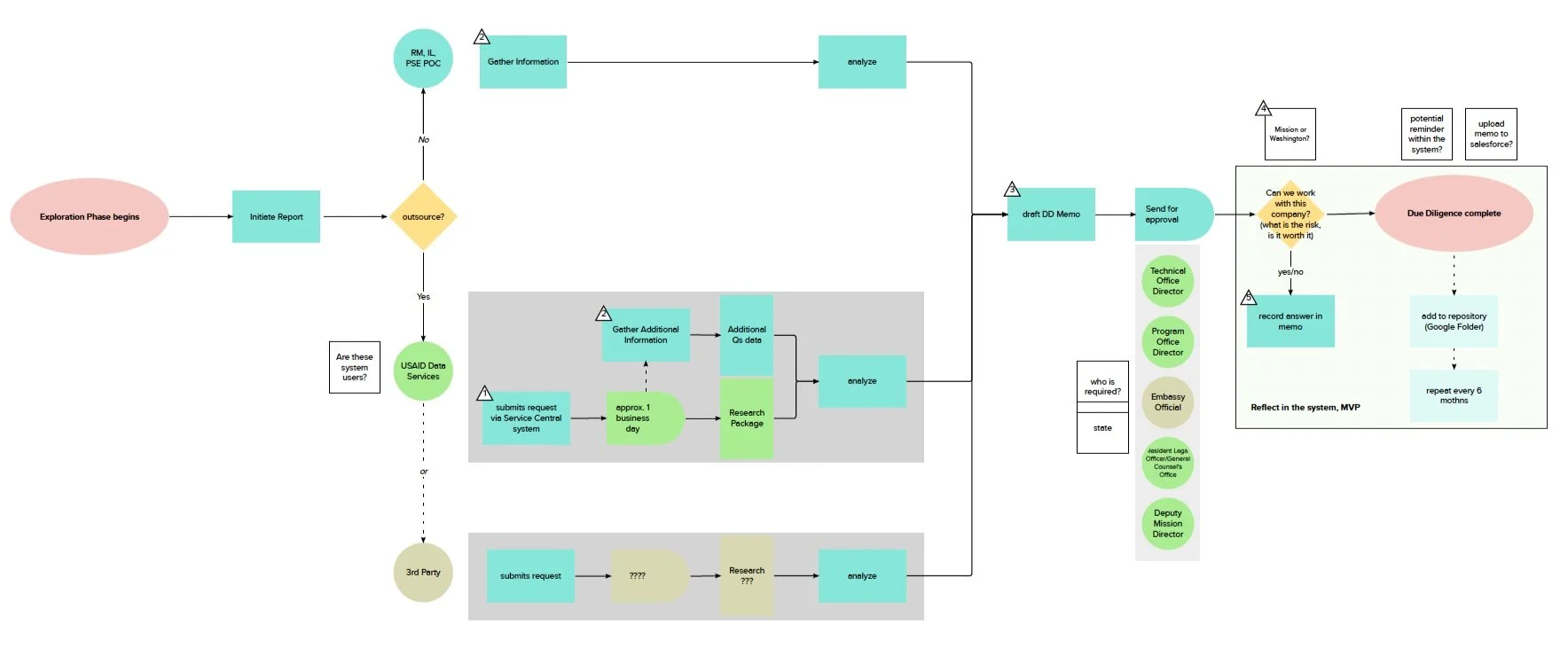 Due Diligence is USAID's process of confirming if a partner organization has any reputational risk. It is standard for every USAID employee engaging in a partnership to complete Due Diligence, so understanding the process, its complexity, and its importance to the system users was the motivation behind the flow below.