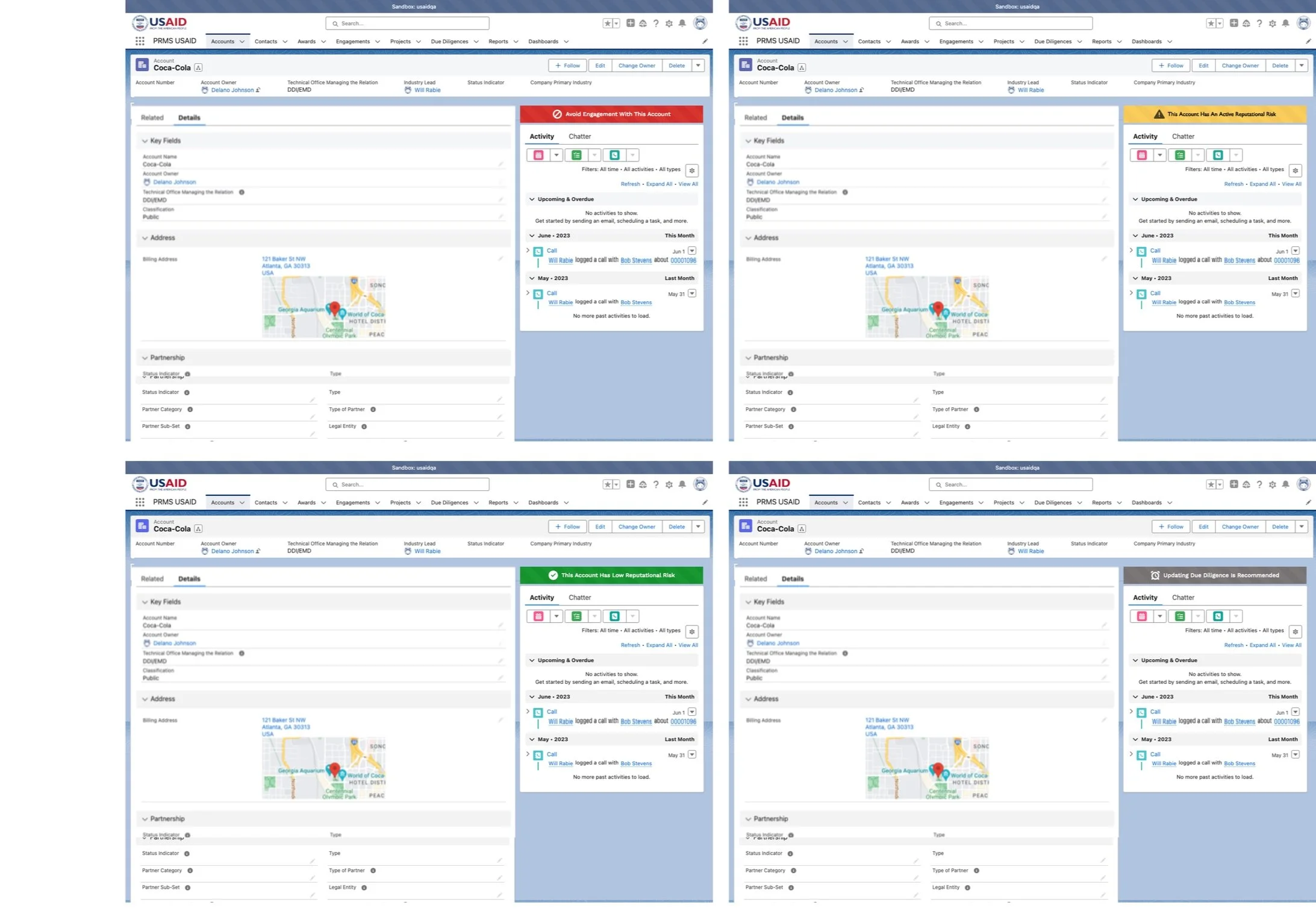 The Design & Strategy, Business, and Technical teams crafted a solution for including Due Diligence in MVP that required designing custom Salesforce components. The components would be integrated into Account pages, providing users real-time risk status updates.