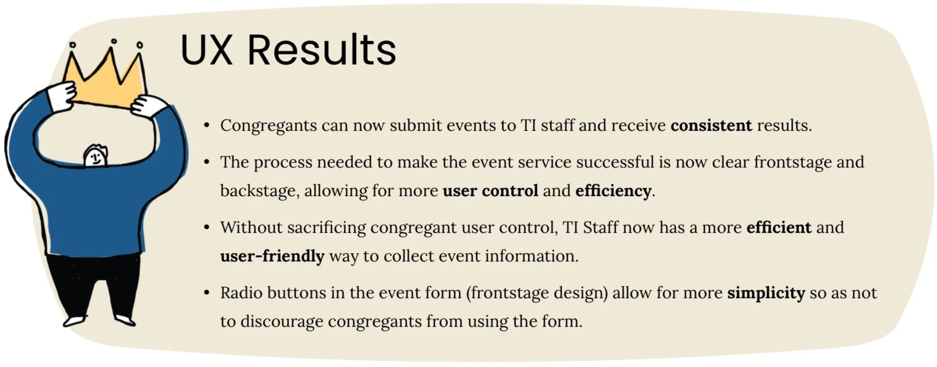 Analyzing the congregant’s journey this way confirmed my prior beliefs entering the research phase. At this point, I realized that two solutions would be necessary to improve the complete event planning service - one that was “user-facing” and one that made managing event information more efficient.