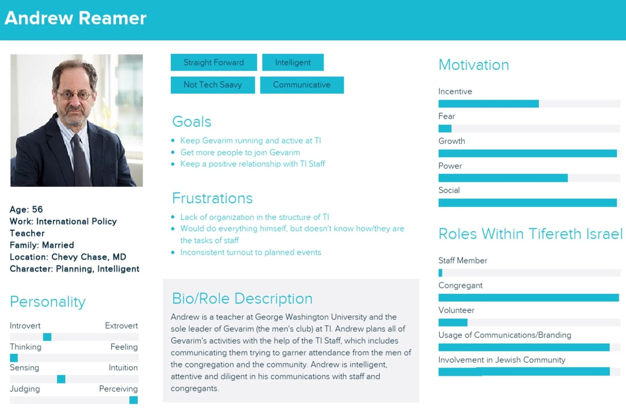 We identified two primary personas based on secondary research: Congregant and TI Staff Member. We were able to pull valuable emotional insights from both. The congregant persona is below.